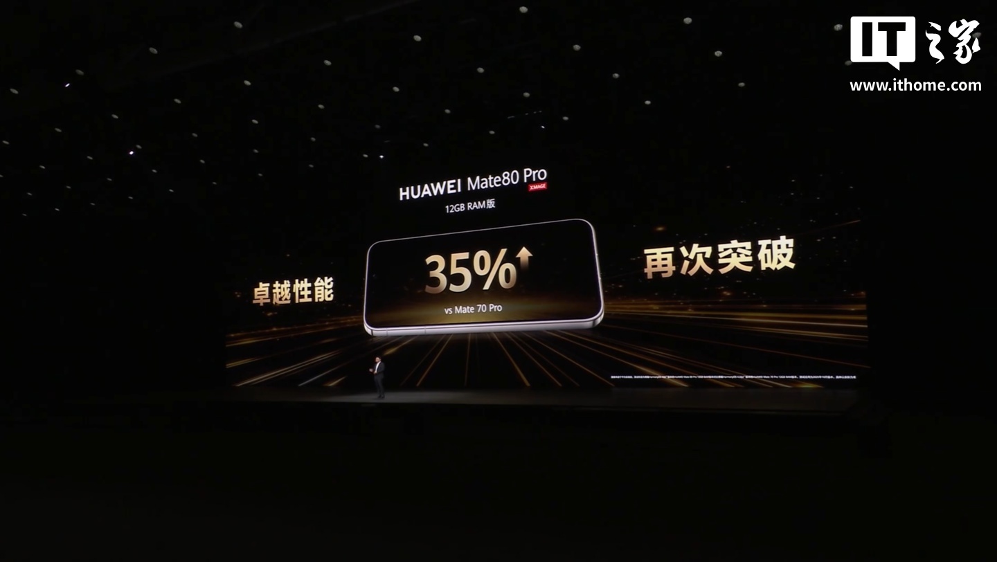 据华为常务董事、产品投资委员会主任、终端 BG 董事长余承东介绍,华为 Mate 80 和 Mate 80 Pro(12GB 内存)手机相比上一代 Mate 70/Pro 性能提升 35%;Mate 80 Pro(16GB 内存)和 Mate 80 Pro Max 相比上一代性能提升 42%。