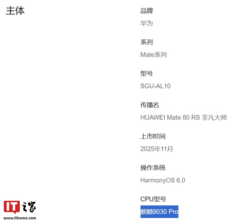 IT之家注意到,目前麒麟 9030 系列处理器已正式亮相。华为官网显示,华为 Mate 80 Pro 手机的 12GB 版本将首发搭载麒麟 9030 标准版处理器、Mate 80 Pro(16GB)/ Mate 80 Pro Max / RS 非凡大师首发搭载麒麟 9030 Pro 处理器。