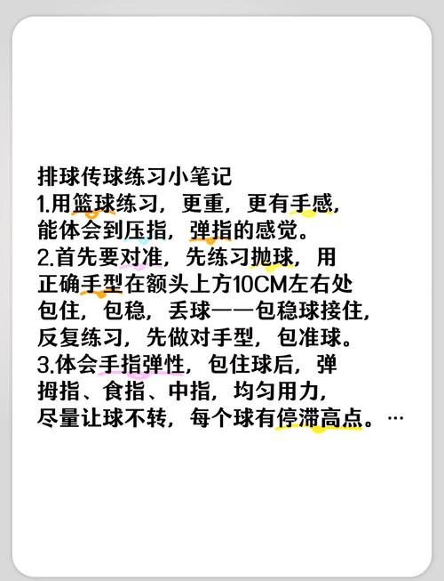 2、新手进行排球传球训练时,需重点关注以下要点以确保动作规范、避免受伤并提升技术:基础动作要领准备姿势 双脚与肩同宽,膝盖微屈,重心前倾(脚掌着地),保持身体灵活移动。 双臂自然弯曲于胸前,手型呈“半球状”(拇指平行,食指张开,其余手指放松包住球)。
