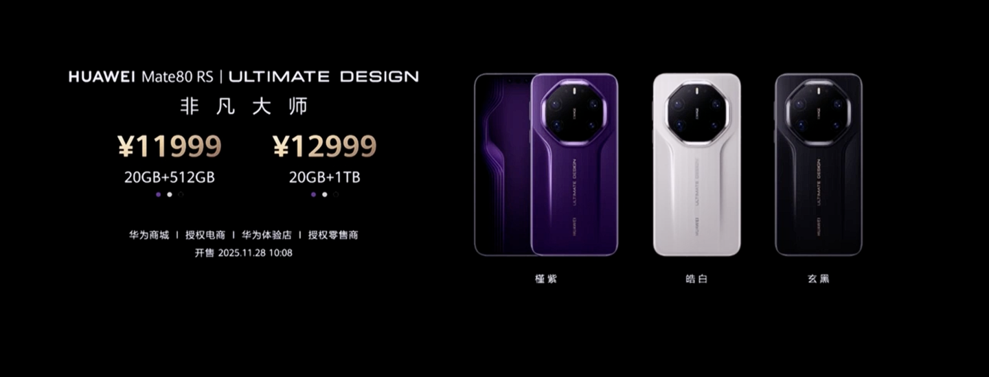 IT之家 11 月 25 日消息,在今天下午的发布会上,华为 Mate80 RS 非凡大师手机正式发布。该机是 Mate80 系列独享 20GB 内存的一款机型,提供 512GB/1TB 两种存储空间,售价分别为 11999/12999 元,将于 11 月 28 日上午 10:08 开售。