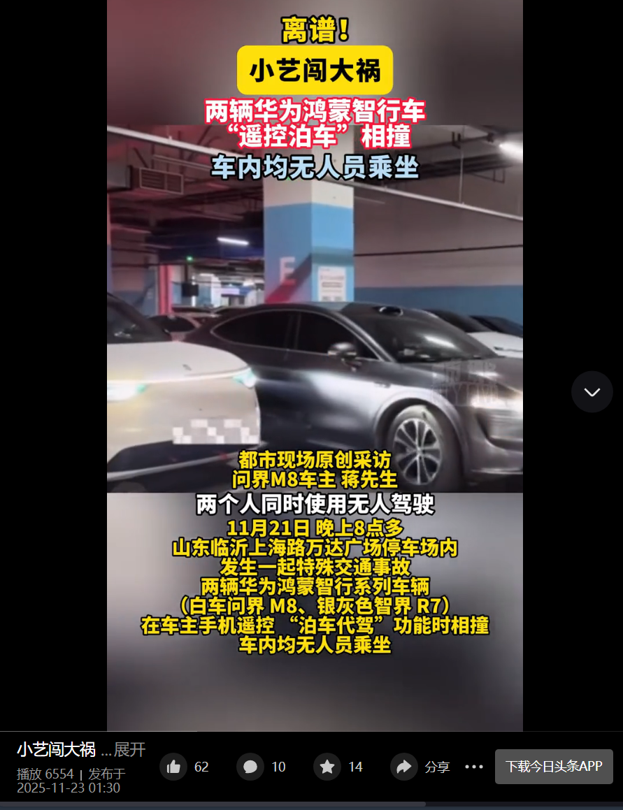 IT之家 11 月 25 日消息,据“都市现场”11 月 22 日报道,山东临沂上海路万达广场停车场内发生一起特殊交通事故:两辆华为鸿蒙智行系列车辆(白车问界 M8、银灰色智界 R7)在车主手机遥控“泊车代驾”功能时相撞,车内均无人员乘坐,引发不少网友关注。