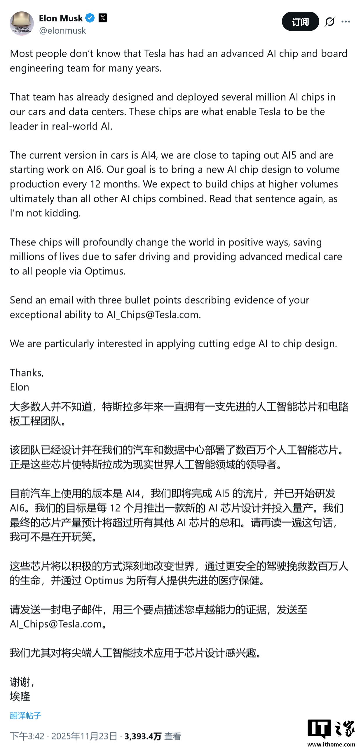 IT之家 11 月 25 日消息,科技媒体 Wccftech 昨日(11 月 24 日)发布博文,报道称埃隆・马斯克(Elon Musk)通过其 X 平台喊话,声称特斯拉若想在“真实世界 AI”的竞赛中获胜,其 AI 芯片产量必须超过英伟达、AMD 及所有其他科技巨头的总和。