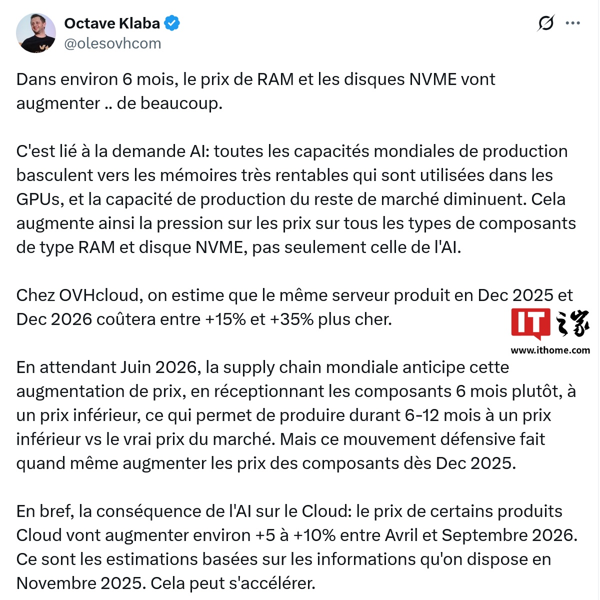Octave Klaba 表示,AI 需求的迅速攀升导致上游存储原厂将生产重心分配到 HBM 领域,导致其它类别产能下降,这加剧了所有类型存储组件的价格压力。OVHcloud 预估,从 2025 年 12 月到 2026 年 12 月,生产同一款服务器的价格将上涨 15~35%。