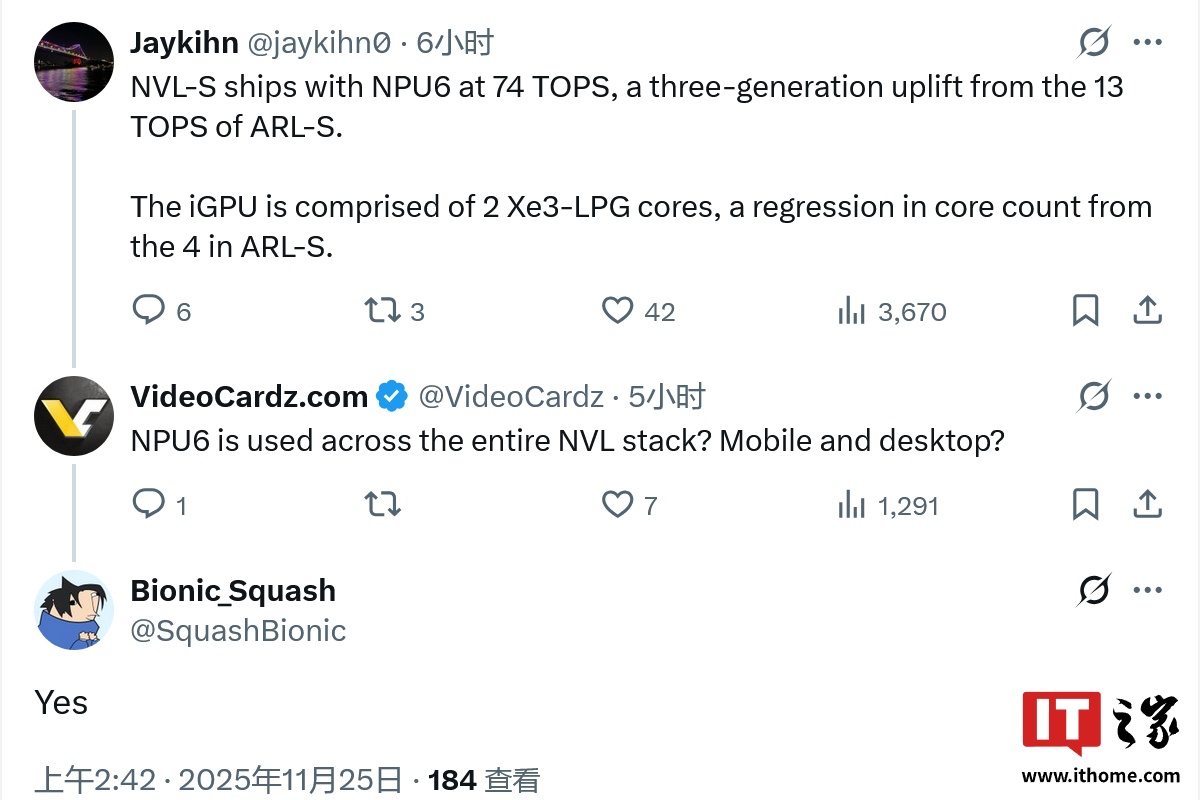 IT之家 11 月 25 日消息,消息人士 @jaykihn0 在北京时间今日的 X 平台爆料中表示,英特尔的 "Nova Lake-S" 处理器将大幅强化 NPU 性能,算力将从 "Arrow Lake-S" 上 NPU 3 的 13 TOPS 提升至 NPU 6 的 74 TOPS,实现三次代际提升。