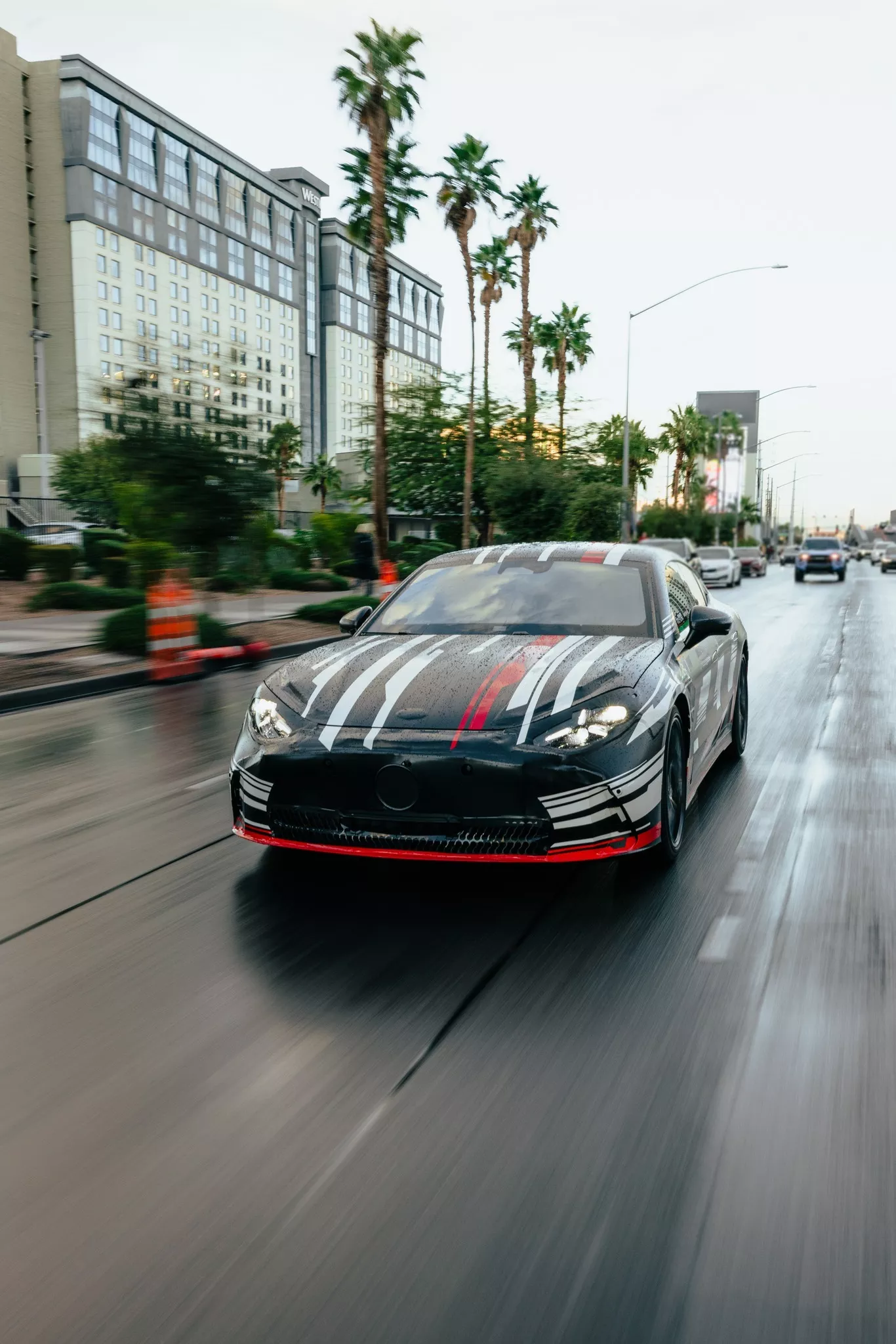 这款高性能电动汽车采用了鲜艳的车身涂装,伪装明显比之前的原型车少,设计灵感来源于 AMG GT XX 概念车,配有星形大灯和封闭式格栅,还可以看到垂直的空气导流帘和细致的前唇分流器。