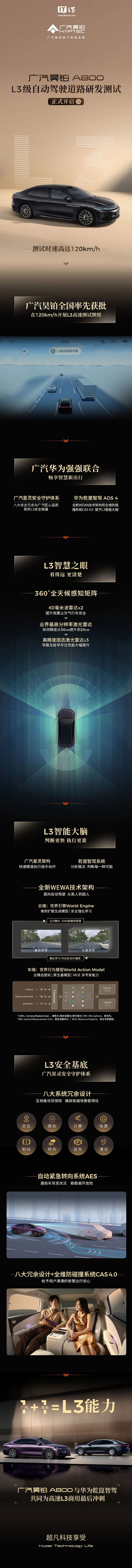 IT之家 11 月 24 日消息,广汽昊铂官方今日宣布:高速 L3 商用冲刺,广汽昊铂 A800 正式启动 L3 级自动驾驶道路研发测试,测试时速可达 120km/h,系全国率先获批该时速下 L3 高速测试牌照的车型。
