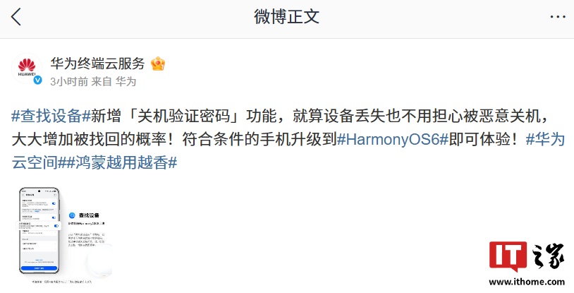 IT之家 11 月 24 日消息,据华为终端云服务官方微博今日分享,华为查找设备新增「关机验证密码」功能,设备丢失后不用担心被恶意关机,可增加被找回的概率。新功能随 HarmonyOS 6 系统上线。