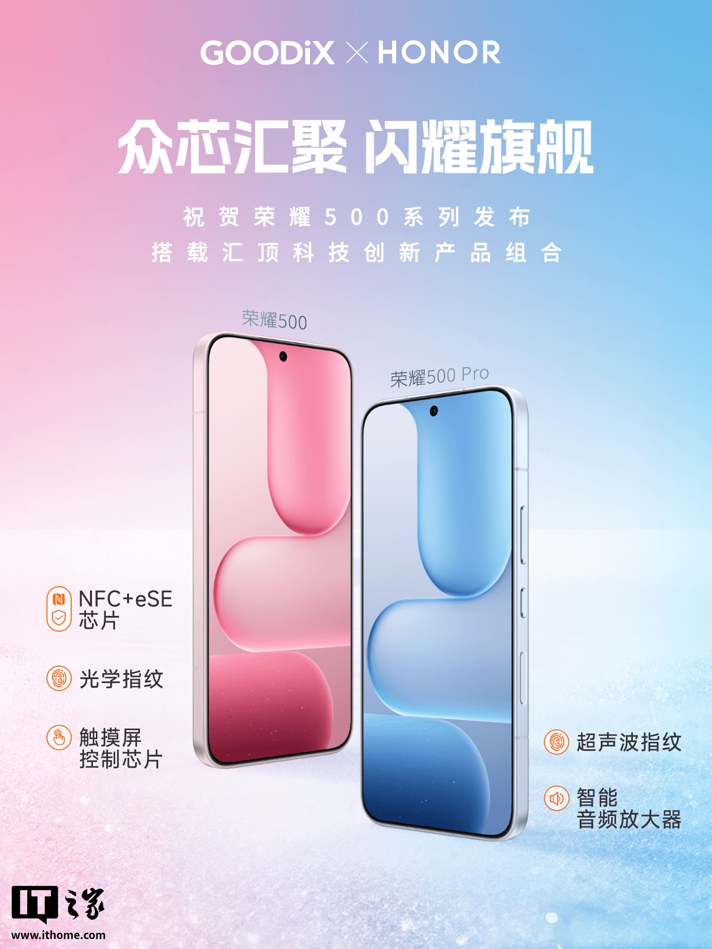 汇顶科技官方今日对荣耀 500 系列进行“认领”:系列新机搭载汇顶科技创新产品组合,包括 NFC + eSE 芯片(安全芯片,通过全球高等级权威认证)、光学/ 超声波指纹、触摸屏控制芯片、智能音频放大器等。据介绍,汇顶自研全功能 NFC 芯片搭配 eSE 安全芯片,支持支付、交通票务、门禁及数字车钥匙等场景。