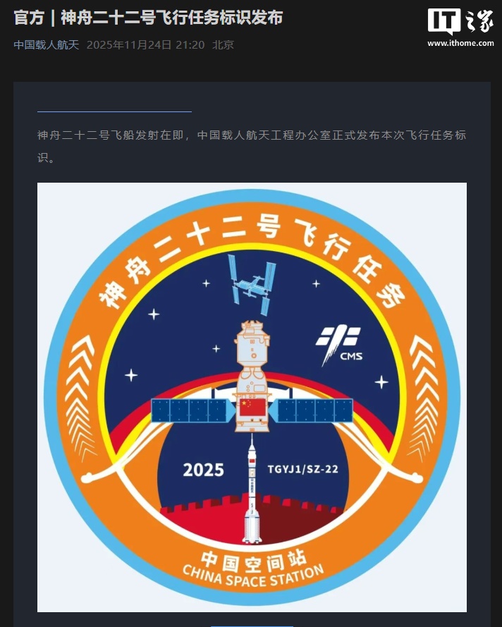IT之家 11 月 24 日消息,据中国载人航天微信公众号消息,神舟二十二号飞船发射在即,中国载人航天工程办公室正式发布本次飞行任务标识。