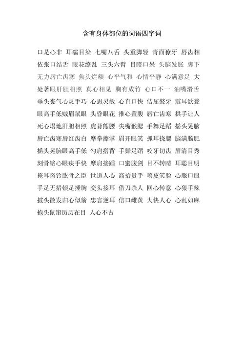 前两个字是身体部位的四字词语有哪些的介绍就聊到这里吧,感谢你花时间阅读本站内容,更多关于身体部位二字词语、前两个字是身体部位的四字词语有哪些的信息别忘了在本站进行查找喔。