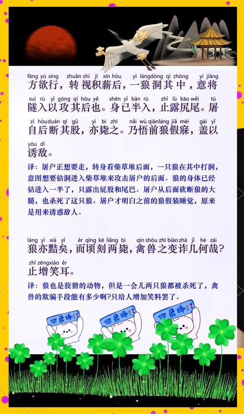 第三则故事则强调了狼的爪牙锐利。狼凭借其锋利的爪牙,试图将屠夫置于死地,但最终还是败给了屠夫的智慧和勇气。这启示我们,面对像狼一样的恶势力,单凭勇猛是不够的,还需要有智慧和策略。只有做到有勇有谋,才能更好地应对挑战。