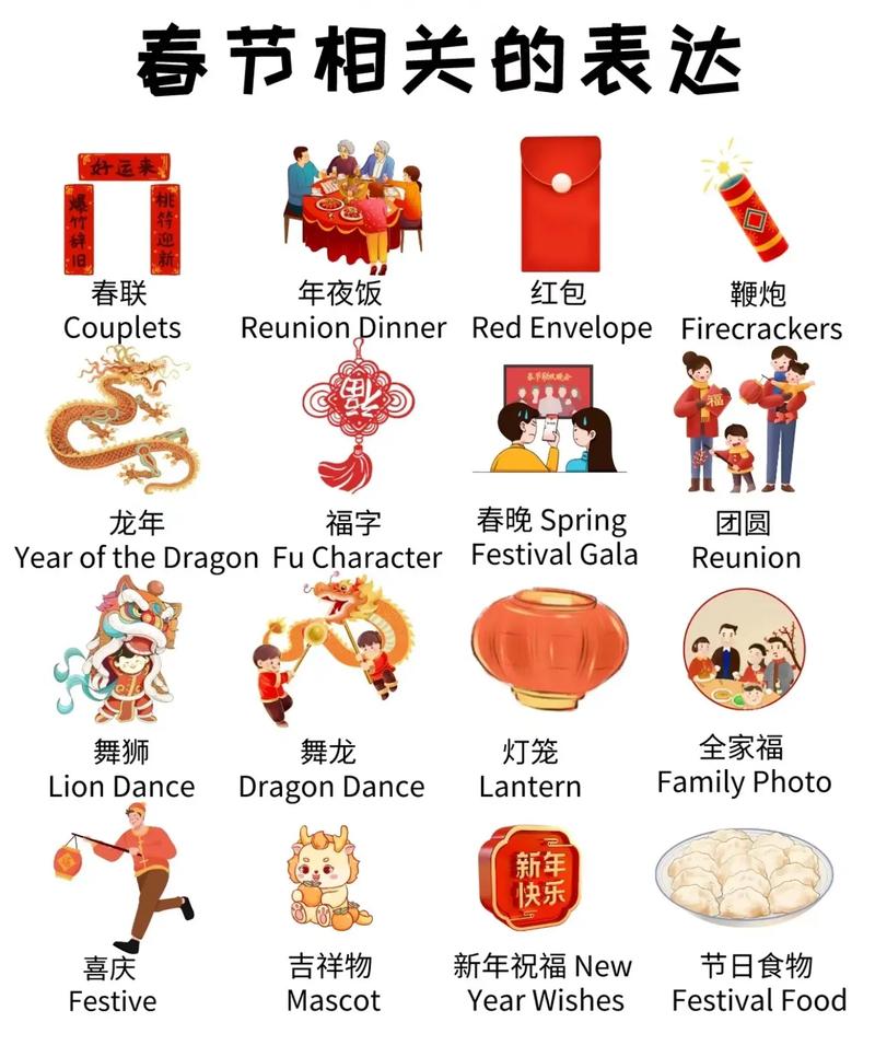 2、春节,即农历一月一日,英文名Spring Festival或Chinese New Years Day,是中国人最重要的传统节日之一,标志着农历新年的开始。人们会进行大扫除、贴春联、放鞭炮、拜年等传统活动,以祈求来年吉祥如意。清明节则在每年的4月5日左右,英文名为Tomb-Sweeping Day。