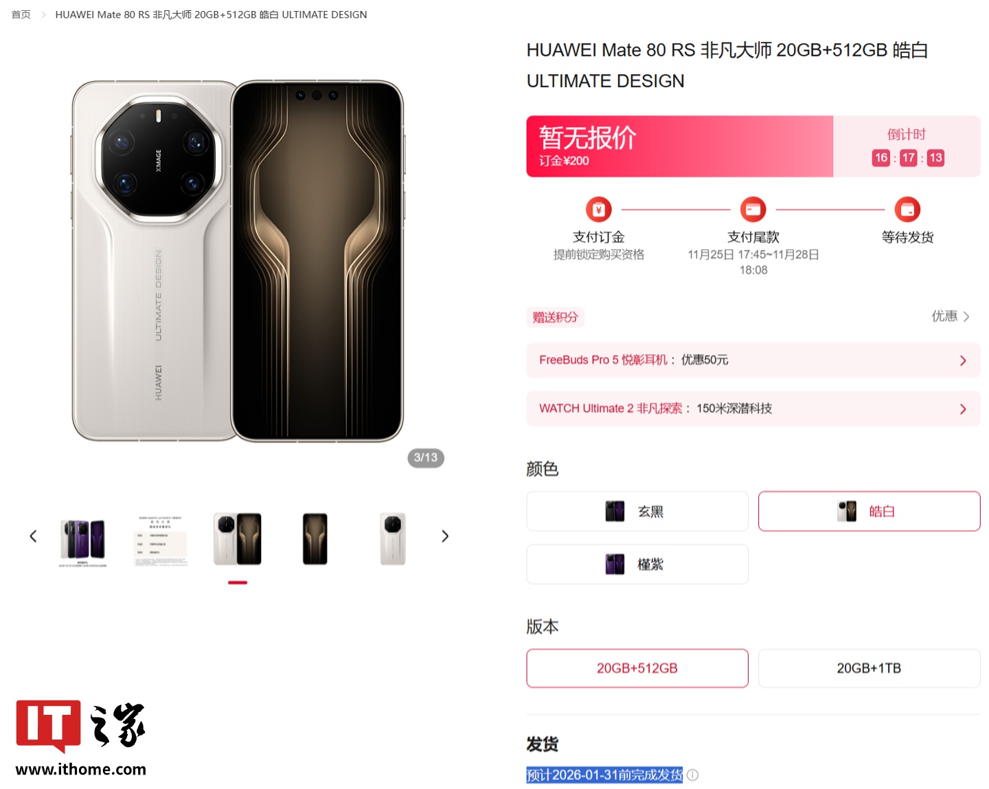 - HUAWEI Mate 80 RS 非凡大师:预计 2026-01-31 前完成发货