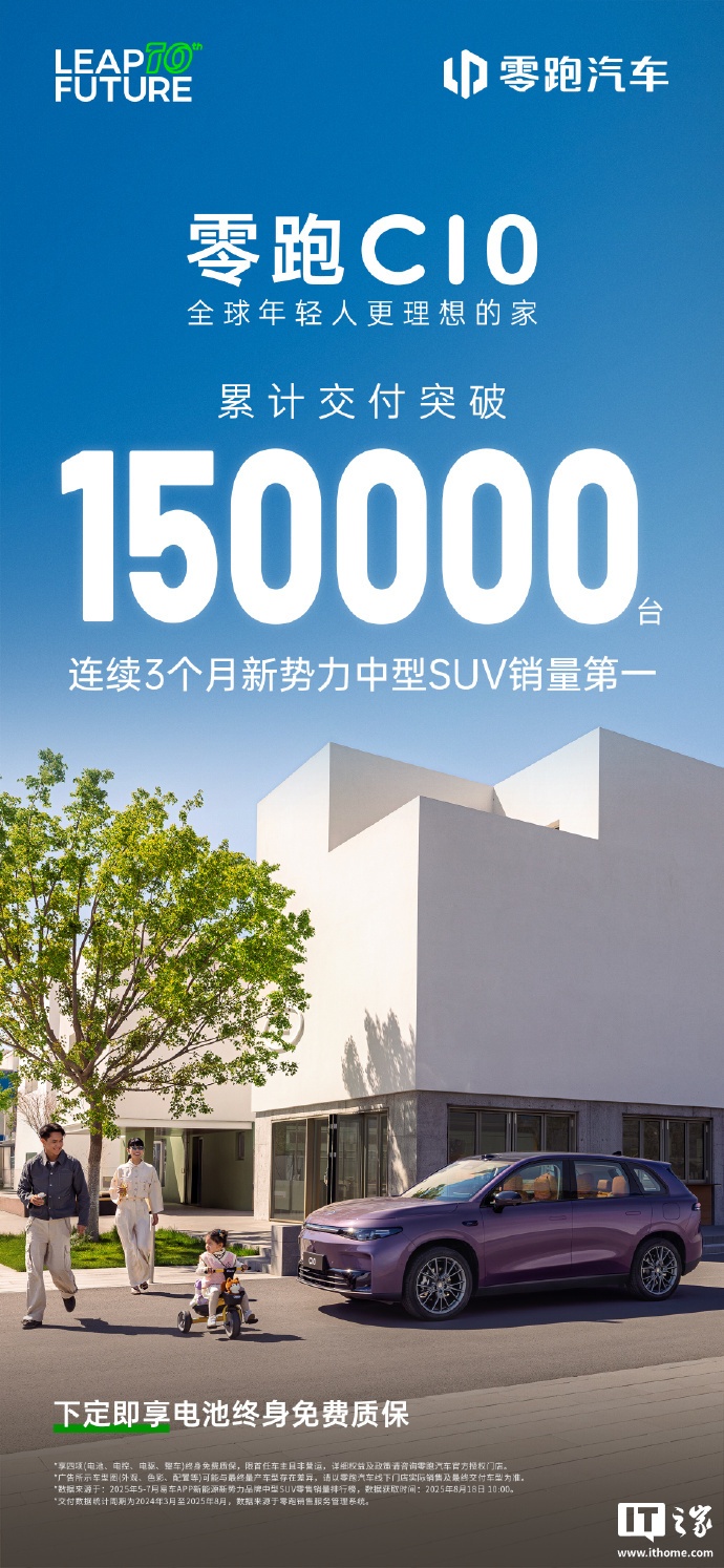 IT之家注意到,零跑汽车还在今年 8 月公布了该车型销量情况:上市 16 个月累计交付突破 15 万台,连续 3 个月新势力中型 SUV 销量第一。