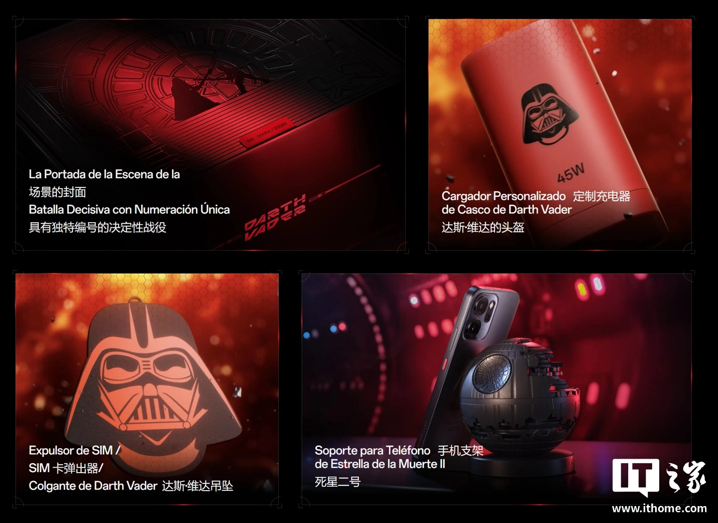 这款手机的包装盒、配件均带有《星球大战》元素,配备红色透明手机壳、同色系充电线、充电器,包装内部满载电影场景,SIM 卡针则是有达斯・维德的大头,还自带有一个死星二号手机支架