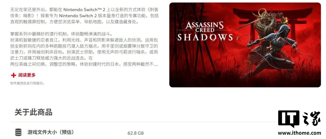IT之家 11 月 24 日消息,日本游戏巨头任天堂公布了《刺客信条:影》在 Nintendo Switch 2 主机上的存储空间占用情况。据官方数据显示,该游戏在 Switch 2 上需要占用 62.8GB 的可用空间。这一数字相较于 PC 版的约 115GB 和 PS5 版的 102GB,明显小了不少。