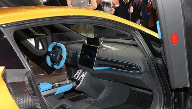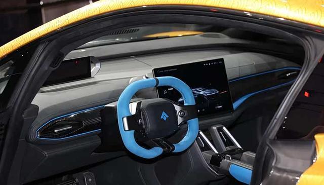进入车内,整体布局并不繁复。中控区域配备一块14.6英寸悬浮式屏幕,仪表盘为8.8英寸液晶屏。方向盘采用六边形造型,并嵌入碳纤维材质,换挡机构为拨杆式电子结构。内饰多处点缀蓝色饰件,包括方向盘、中控台及副仪表台区域,试图营造一种科技感与运动感并存的氛围。座椅和门板使用来自欧洲供应商的定制皮革,质感偏细腻,但未过度强调豪华属性。