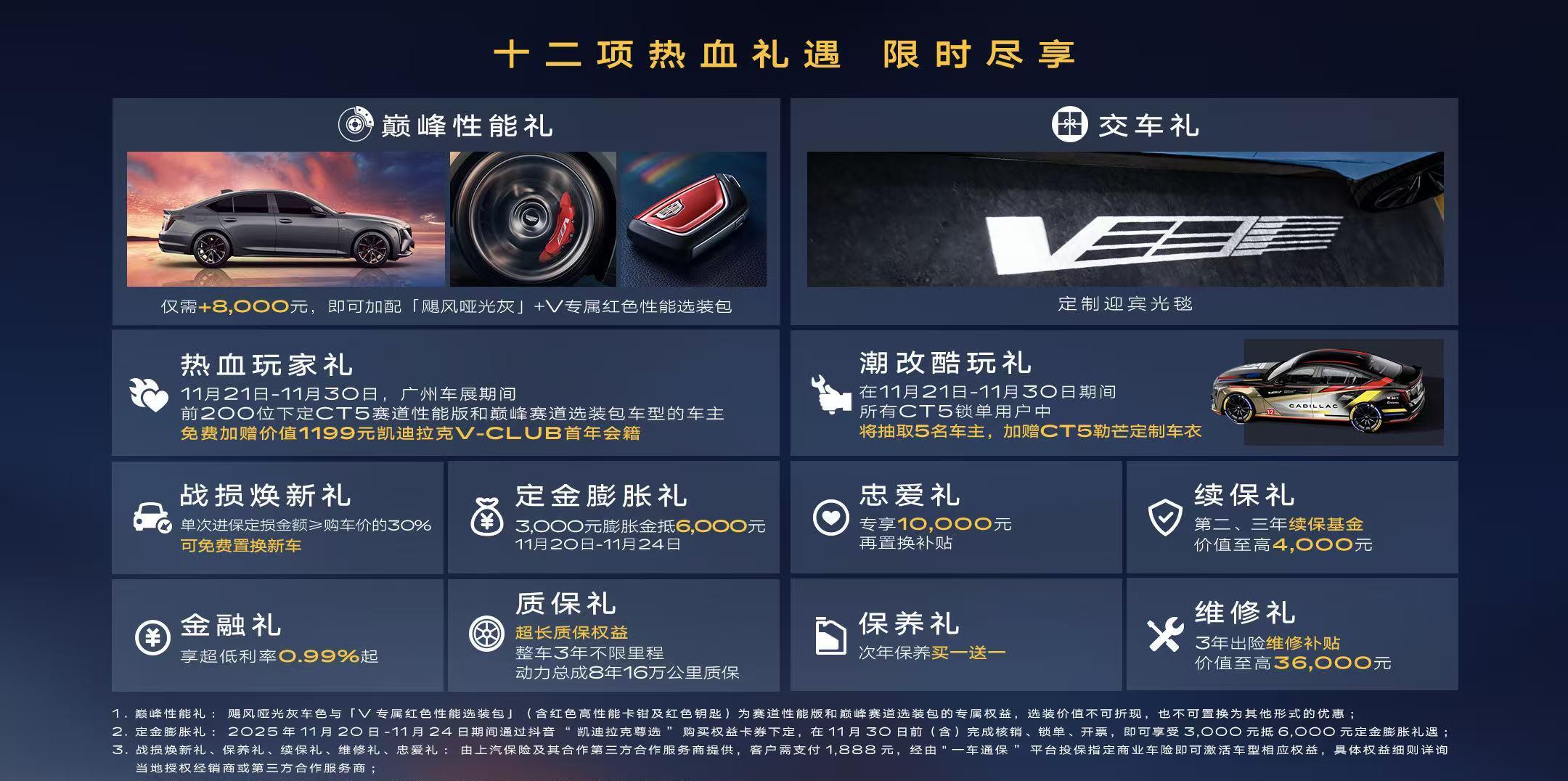 凯迪拉克全新CT5限时一口价20.69万元起!2025广州车展凯迪拉克展台化身热血赛道派对,明星车型全新CT5以满改姿态热血登场。此次,全新CT5发布了V专属性能车色「飓风哑光灰」及V专属红色性能选装包:包括专属Brembo V标涂装红色高性能卡钳、赛道专属红色钥匙等性能装备。只需8000元就可解锁价值18000元热血装备的巅峰性能礼!值得一提的是,全新CT5还推出了王炸级“战损焕新礼”,车辆单次定损超三成即可免费置换等价新车,为年轻人的第一台后驱车霸气兜底。源于纯粹的赛道热爱,凯迪拉克全新CT5出厂即满改,本色出街热血上场。满改姿态 传承赛道基因