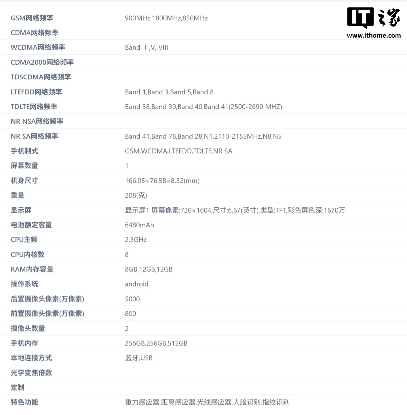 此外,这台手机的重量是 208 克,搭载 6480mAh 电池,配备 5000 万像素后摄、800 万像素前摄,内存可选 8GB、12GB,存储空间可选 256GB、512GB。