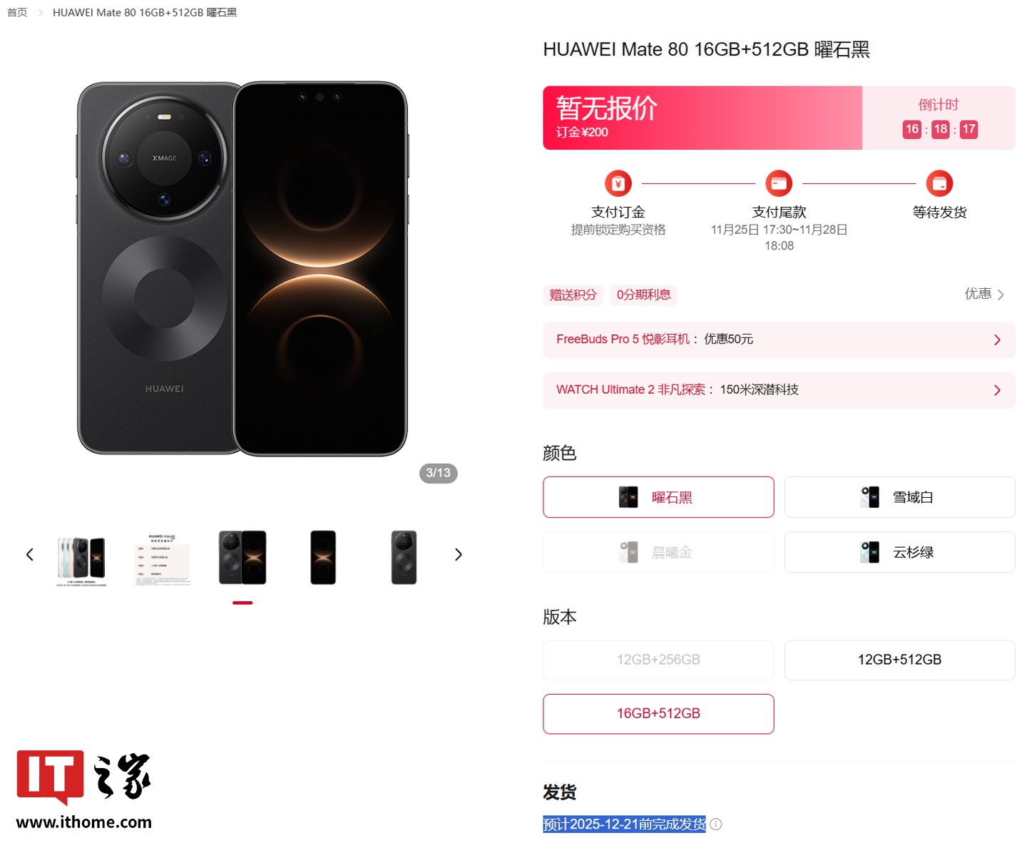 - HUAWEI Mate 80:预计 2025-12-21 前完成发货