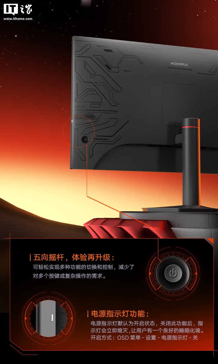 此外,这款显示器采用小底座设计,背部配备五维摇杆,可便捷操控 OSD 菜单,配备两个 HDMI 2.0 接口和一个 DisplayPort 1.4 接口,兼容 PC、Xbox、PS5 等电脑 / 游戏机,还拥有一个音频输出接口,可外接各种音频设备。