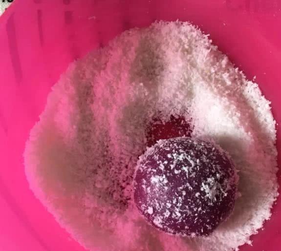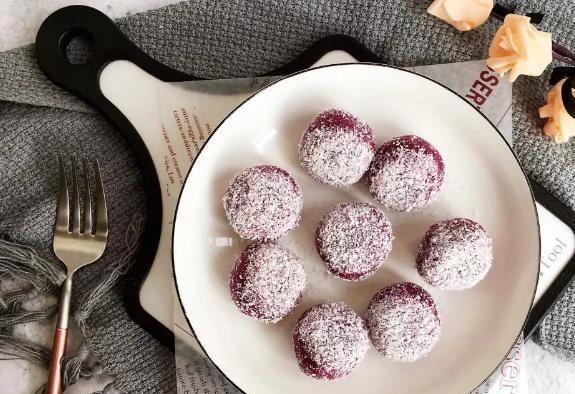 蒸好的紫薯球得趁热裹上椰蓉。椰蓉就像糯米糍的外衣,少了它总觉得缺点啥。拿一个蒸好的小球,扔进椰蓉堆里滚一圈,裹得满满当当,香气一下就扑鼻而来。裹好后摆盘,立马就能开吃,热乎乎的口感最好!