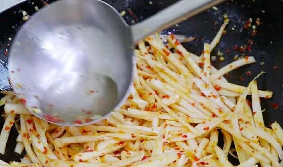 香味炒出来后,把小米辣丢进锅,快速翻炒几下。接着把白菜帮丝倒进去,开大火猛炒两分钟。为什么要大火?因为白菜帮水分多,大火能快速锁住水分,保持脆嫩口感。炒到白菜帮稍微变软,加入半勺清水,盖上锅盖焖一分钟,让水分充分释放。