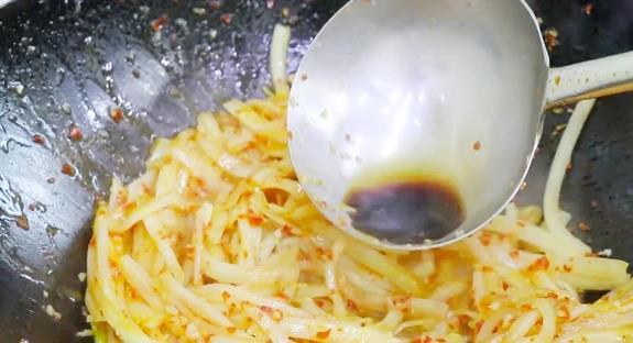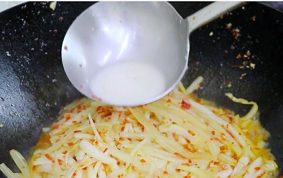 炒了一分钟左右,汤汁开始冒泡,这时候把淀粉水缓缓淋进去,边淋边翻炒。淀粉水的作用是勾芡,让调料紧紧裹在白菜帮上,吃起来每一口都入味。汤汁变浓稠后,立马关火装盘,一盘色香味俱全的炒白菜帮就搞定了!