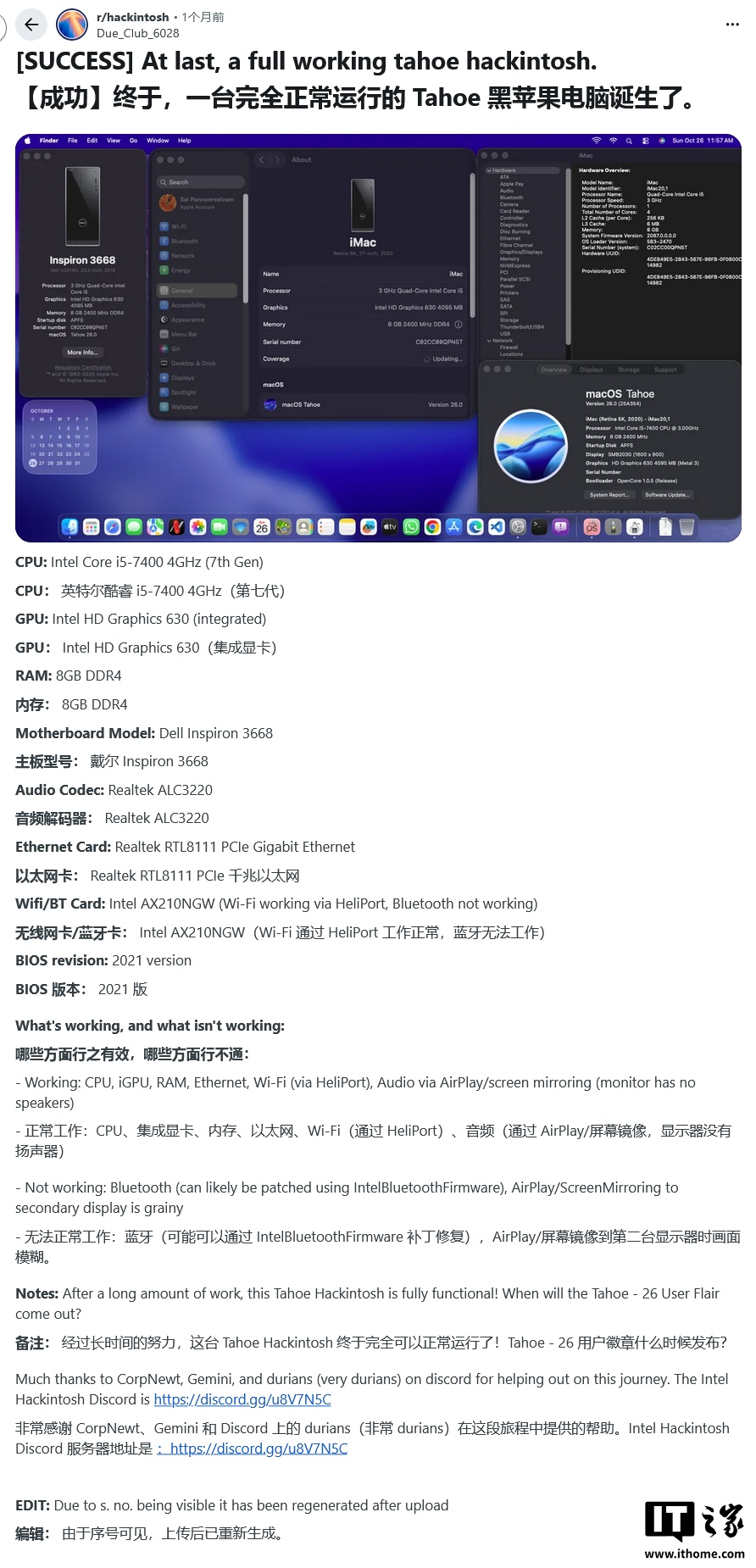尽管前景黯淡,黑苹果社区依然展现了强大的技术热情,迎来了这场“最后的狂欢”。IT之家援引博文介绍,在 macOS Tahoe 正式版发布后,社区用户在 Reddit 等平台分享了他们的成功经验。