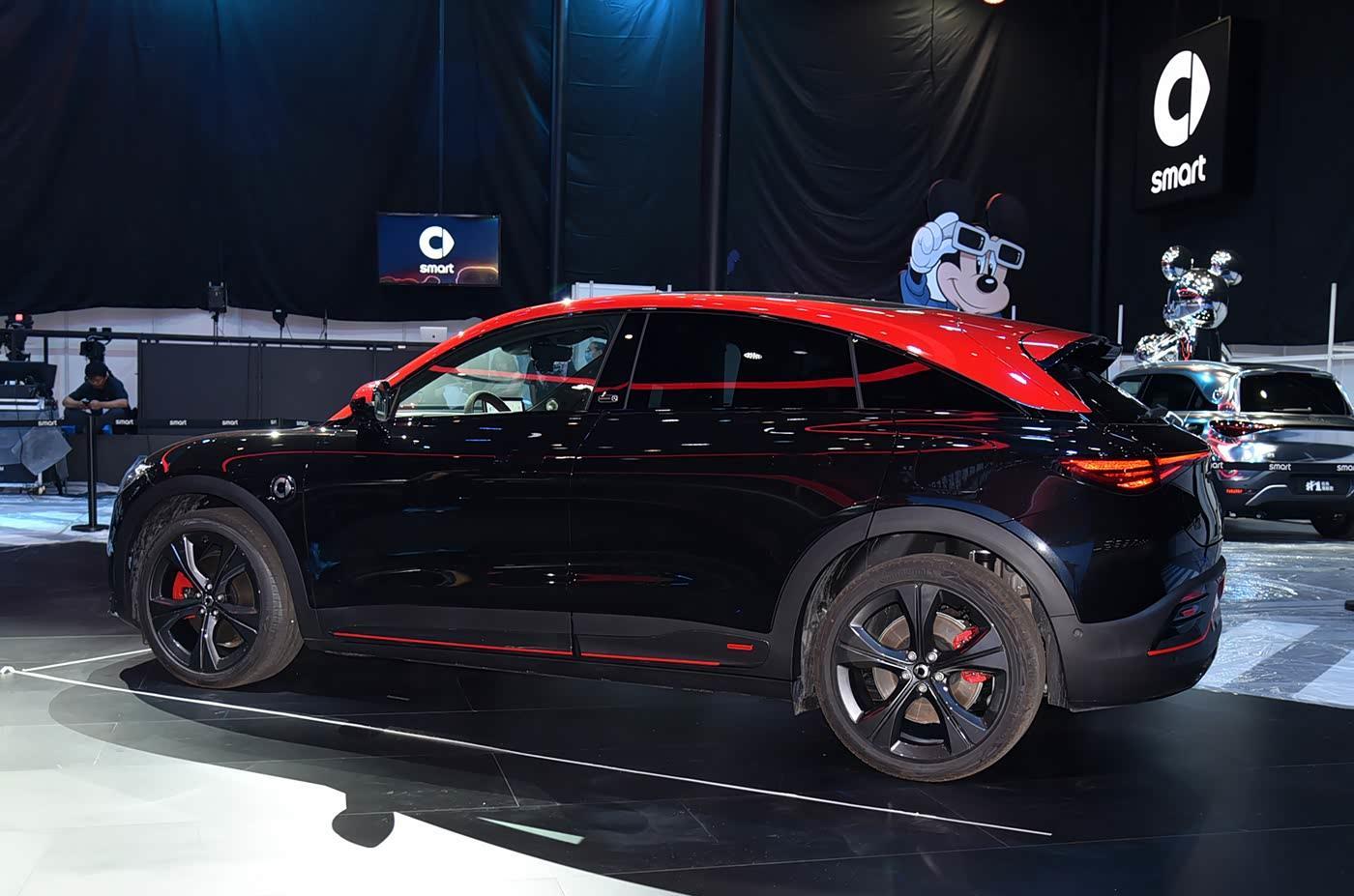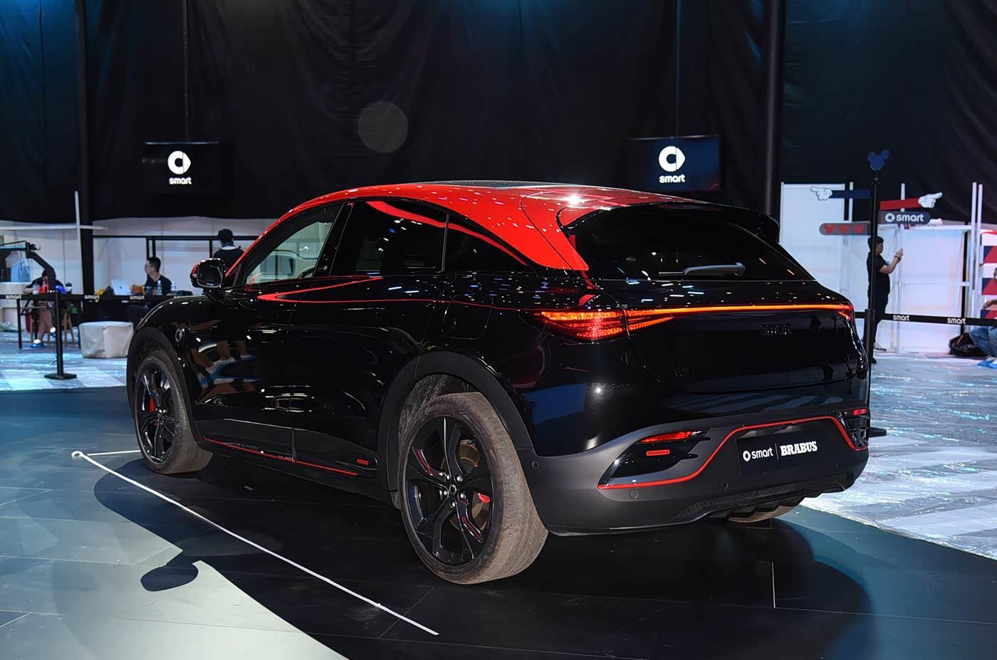再来看车身侧面部分,作为紧凑型轿跑 SUV,smart 精灵 #3 的车身尺寸为 4400/1844/1556mm,轴距却达到 2785mm,“四轮四角” 的设计理念让短车身与长轴距形成巧妙平衡,完美诠释 “紧凑于外,宽适于内” 的空间哲学。侧面线条是其设计精髓:弓形车顶从 B 柱开始快速下压,形成流畅的溜背曲线,搭配隐藏式电动门把手与无框车门,将风阻系数控制在同级优秀水平,同时营造出跑车般的优雅姿态。而普通版本搭载 19 英寸多辐式轮毂,采用低风阻设计以提升续航;BRABUS 性能版则配备全新十辐 Monoblock Z 系列轮圈,还提供 21 英寸 BRABUS “Platinum Edition” 高科技锻造轮圈选装,红色刹车卡钳的加入进一步强化运动属性。
