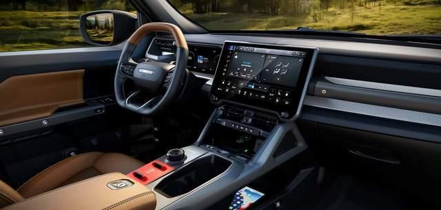 内饰方面,新车配备了一对垂直屏幕,12.3英寸驾驶显示屏和14.5英寸中央信息娱乐屏幕,搭载Uconnect 5。2026款Jeep Recon没有按钮,采用数字暖通空调控制,并且还配备了高级Alpine音响系统,座椅下方设有扬声器。第二排座椅折叠后,该车提供最高65.9立方英尺的货物空间。Jeep设计了前备箱,拥有3.0立方英尺的货物空间,以容纳随身行李箱。