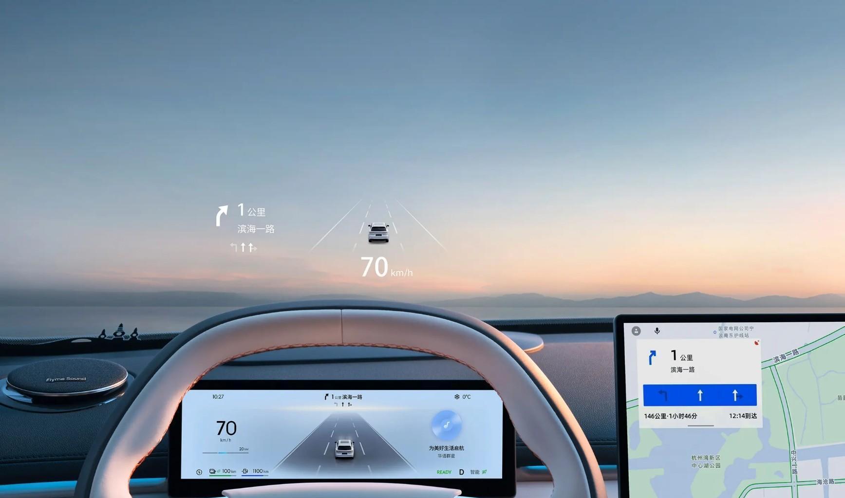 进入车内,首先就是非常柔软舒适的棉花糖座椅,并且前排是带14点式按摩,还带坐垫,门板中央扶手以及天窗的按键,都保留了物理按键,整个操作起来也会更加的方便,中控方面它也非常的讲究,14.6寸中控大屏边框是非常的窄,车机搭载Flyme Auto系统,交互逻辑是非常的顺手,同时前方还配有一块13.8英寸的HUD,以及16扬声器、头枕音响等舒适配置也没有缺席。
