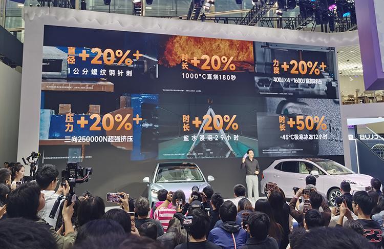 在现场,上汽也不忘再宣传这款电池的实力。它扛住了1公分螺纹钢针刺、高温直烧、小球撞击、三向超强挤压、盐水浸泡和-45℃极寒冰冻实验,取得了非常不错的效果,东北的老铁们买车又多了一个选择。