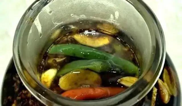 装瓶也有讲究。找个干净的玻璃罐子,千万别有油星子。先铺一层辣椒,再撒一层姜片蒜片,再铺辣椒,层层叠叠压紧实。料汁晾凉后全倒进去,最后加20克高度白酒,杀菌又增香。盖紧盖子,放到阴凉地方,半个月后就能开吃。