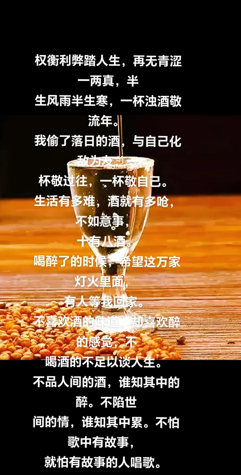 6、不再鲁莽冲动,只想稳稳当当过好下半辈子。拿蔽回首往事,历历在目,这杯酒可谓是五味杂陈。4敬人生,听闻人生,全是心酸。4敬往事一杯酒,余生,好好爱自己。4用一杯酒,敬过去的自己。50、敬爱情,听闻爱情,十人九悲。