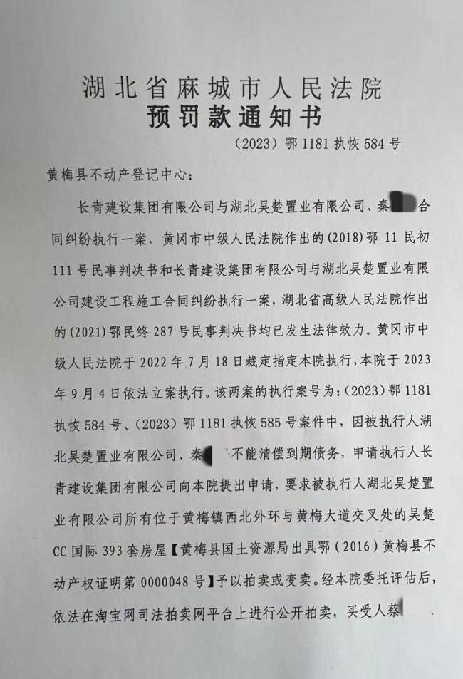 此外,因一笔7000万的借款纠纷,长青建设公司也起诉了吴楚置业公司。2018年,黄冈中院作出一审判决,认定吴楚置业公司需返还长青建设公司7000万元及其利息。吴楚置业公司上诉,湖北省高院二审维持了原判。长青建设公司相关负责人表示,因吴楚置业公司未能偿还债务,他们向法院申请对吴楚CC国际的相关房产进行拍卖。之后,黄冈中院指令麻城市法院执行拍卖,麻城市法院委托评估公司实地调查发现,在吴楚CC国际106套住宅中,部分房屋已经有人装修入住或大门上锁无法打开,遂将其中的85套进行司法拍卖。
