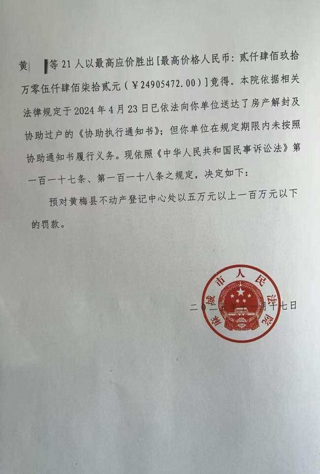 因在规定期限内未按照协助通知书履行义务,麻城市法院预对黄梅县不动产登记中心罚款。黄梅县不动产登记中心相关负责人回应称,有收到这份《预罚款通知书》,已经安排人跟麻城市法院联系,会解释沟通好此事。