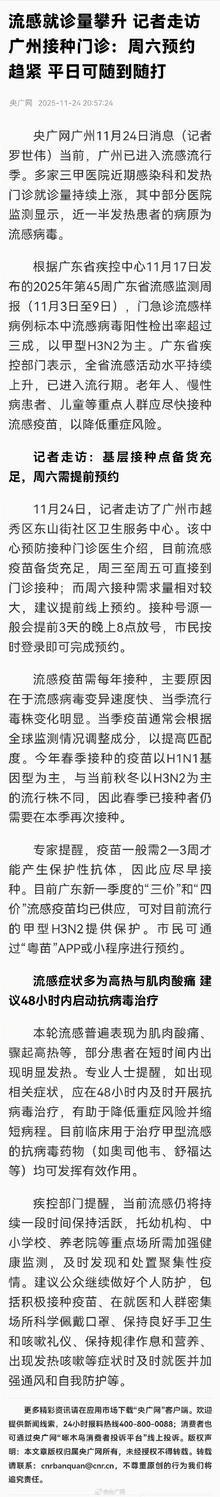 11月24日,广州市越秀区东山街社区卫生服务中心预防接种门诊医生表示,目前流感疫苗备货充足,周三至周五可直接到门诊接种;周六接种需求较大,建议提前线上预约。接种号源通常会提前3天的晚上8点放号,市民按时登录即可完成预约。