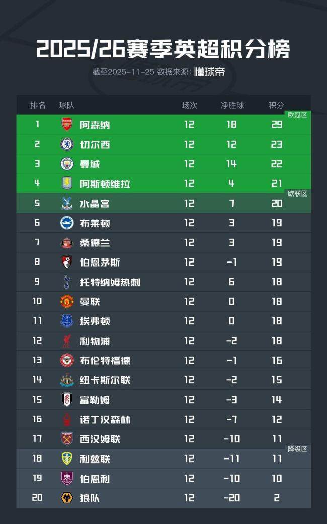 北京时间11月25日,2025/26赛季英超联赛第12轮全部结束,积分榜形势发生变化。阿森纳在北伦敦德比中主场4-1大胜托特纳姆热刺,取得9胜2平1负的战绩,以29分继续领跑积分榜。切尔西以6分之差排在第二位,下一轮两队将在斯坦福桥球场直接对决。