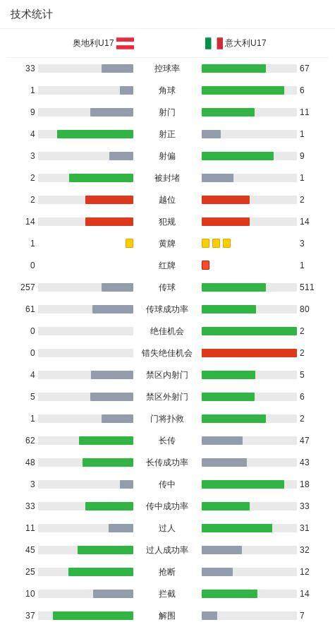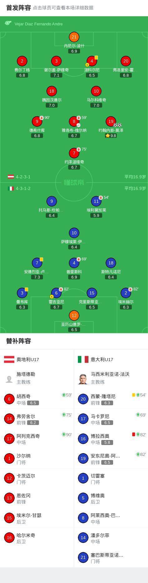 在比赛中,双方都有不少精彩瞬间。第8分钟,卢翁戈在弧顶处起脚射门,但皮球偏出球门。第12分钟,伊纳西奥底线传中,埃米赫尔推射高出横梁。第39分钟,曼布库抢球犯规,裁判出示黄牌警告。第69分钟,西蒙-隆塔尼踢人犯规,同样被黄牌警告。第84分钟,莫泽外围起脚远射,但隆戈尼稳稳将球抱住。第90+2分钟,意大利U17球员博拉西奥因肘击被红牌罚下。随后,莫泽在第90+3分钟再次破门,帮助奥地利锁定胜局。
