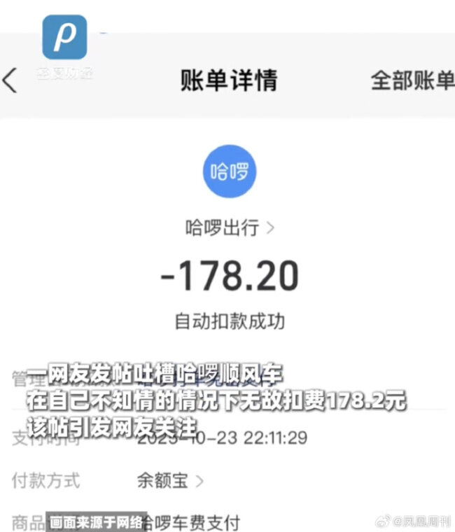 近日,浙江一网友在社媒发帖,吐槽哈啰顺风车在自己不知情的情况下无缘无故扣费178.2元,该帖引发网友关注。