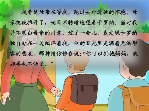 4、课文讲述了一个叫卡罗纳的孩子失去母亲极度痛苦,在母亲去世后回到学校上课的一天中得到老师、同学、家长的关爱的事。《卡罗纳》诠释了爱的真谛,选编这篇课文的目的是为了引导学生感受人与人之间纯真的感情,体会到人与人相互关爱,生命才更有意义,人生才更幸福。