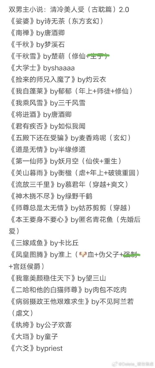 3、作者:糖水巫婆。《天域苍穹》,作者:风凌天下。《别闹,娘子们》,作者:宫槐。《一攻天下》,作者:古萧。《攻尽三界》,作者:仕途之妖。《端王爷》,作者:默那珂。《拐到手的宝贝们》,作者:秋叶残露。《晋江男穿到起点里的那点事》,作者:蛋黄。《昏君养成计划》,作者:暖荷。