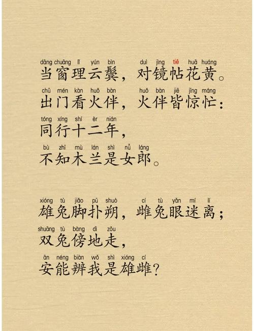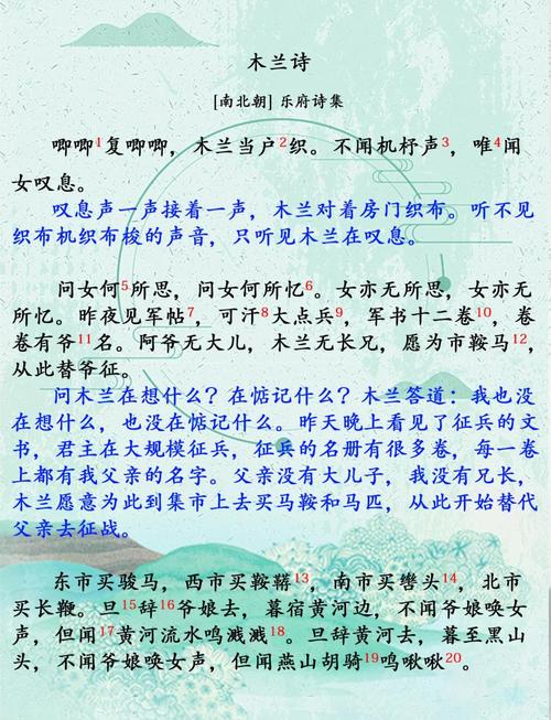 《木兰诗》和《孔雀东南飞》被并称为“乐府双璧”或“叙事诗双璧”。《木兰诗》是一首北朝民歌,收录于宋郭茂倩的《乐府诗集》中,属于《横吹曲辞·梁鼓角横吹曲》。这首诗叙述了木兰女扮男装,替父从军的故事,她在战场上立下赫赫战功,但凯旋后却拒绝封官,只希望返回家中与家人团聚。