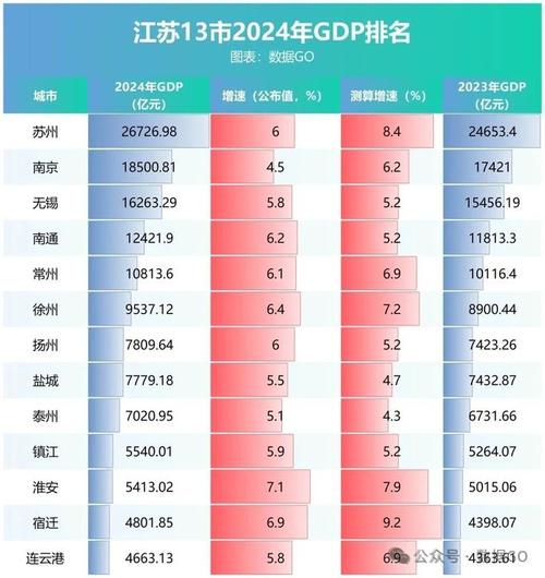 3、江苏省13个城市的GDP排名情况如下: 苏州市 南京市 无锡市 南通市 常州市 徐州市 扬州市 盐城市 泰州市 镇江市 1 淮安市 1 宿迁市 1 连云港市 苏州市位居全省GDP排名的首位。从经济增长速度来看,所有城市的经济增速均超过了4%。
