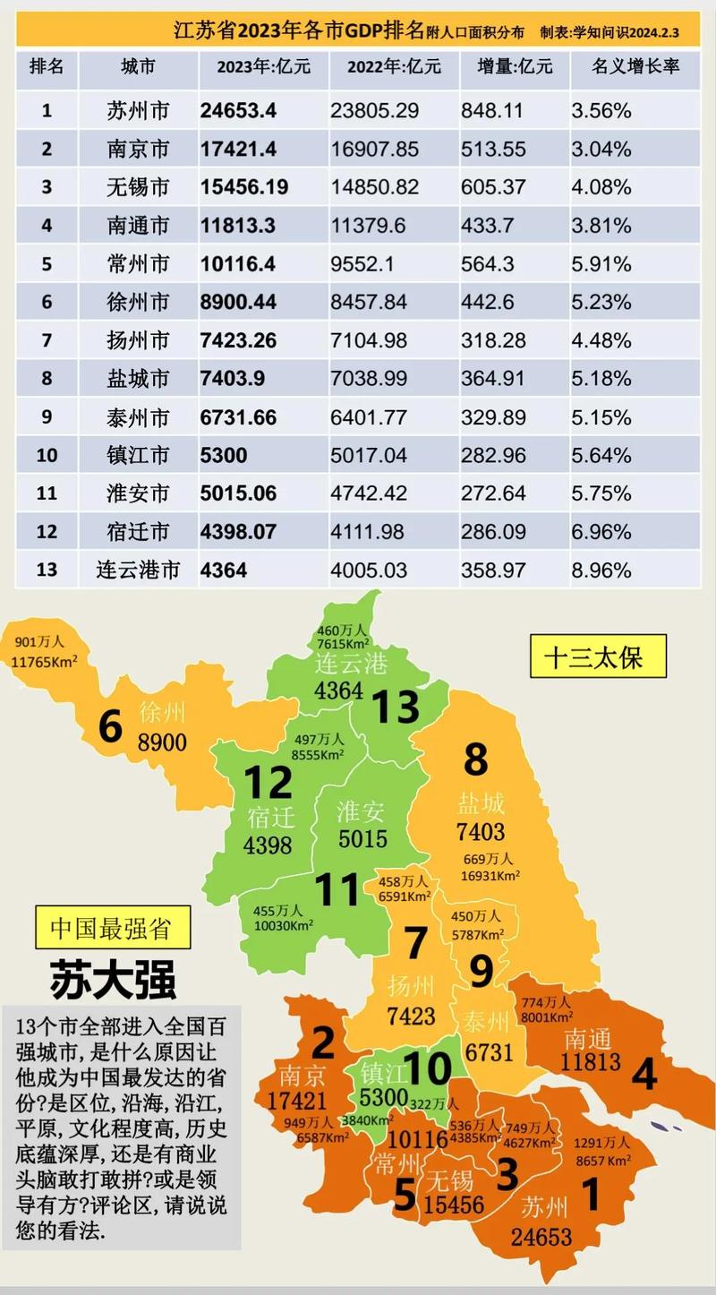 4、江苏省的13个城市均已完成GDP数据的统计,其中无锡展现出强劲势头,有潜力超过南京,而扬州则位列第七,宿迁保持第十二的位置。江苏作为国内经济发达的省份之一,其制造业实力在全国占据首位,被誉为“制造业第一大省”。2023年,江苏全省的GDP总量达到128222亿元,位居全国第二。