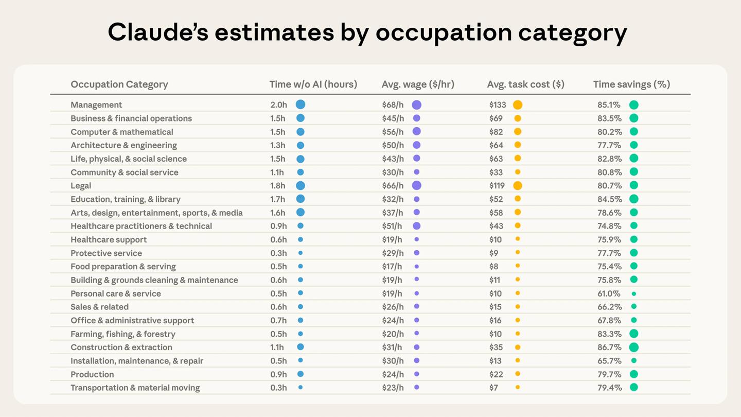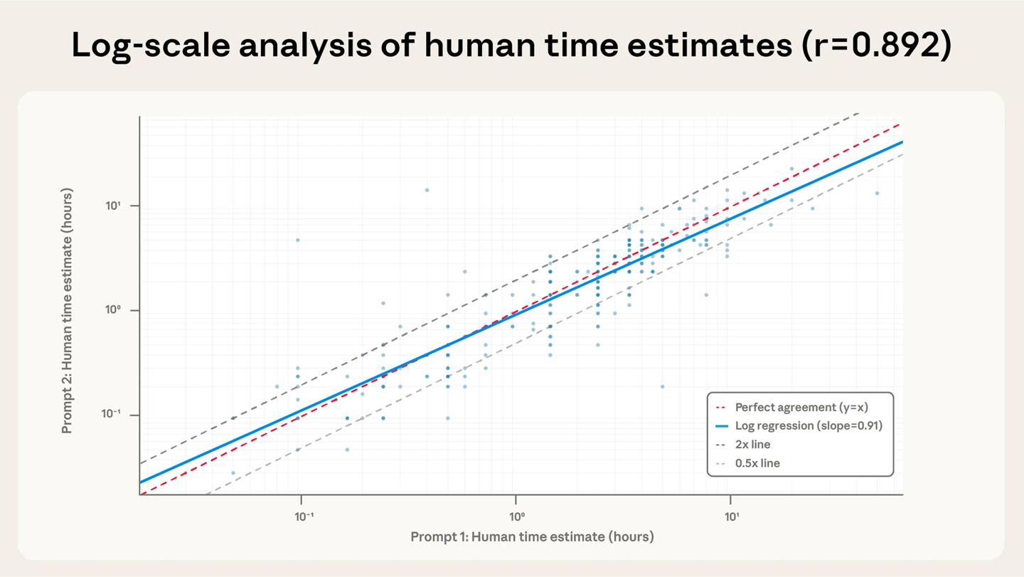 该研究目的是量化 AI 在真实工作场景中对生产力提升的具体效果。研究团队采用了一种保护用户隐私的分析方法,抽样分析了十万次来自 Claude.ai 用户的真实对话记录,通过让 Claude 估算这些对话中涉及任务的完成时间,研究人员得以对比有无 AI 协助下的效率差异。
