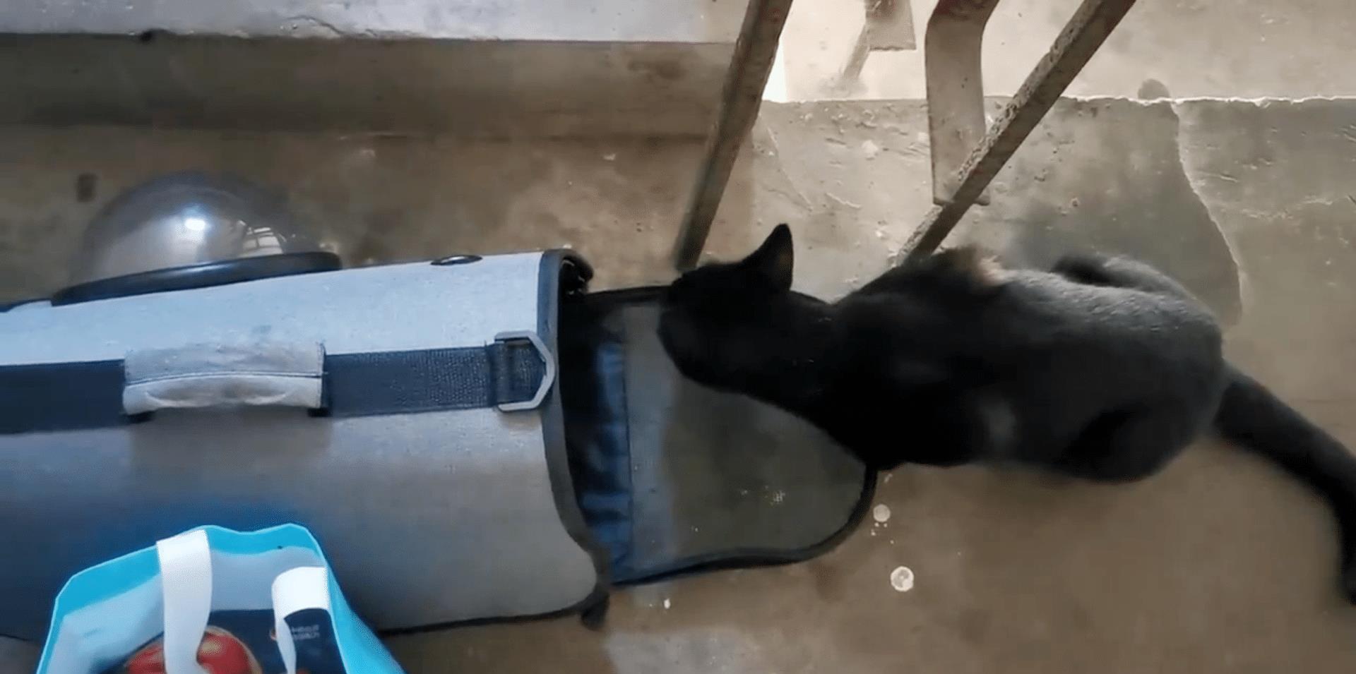接走小黑的那天,天气特别好,新主人把空猫包放在地上,里面没有放任何食物,小姐姐对喵星人说:“小黑,你想要新家就进去吧!”