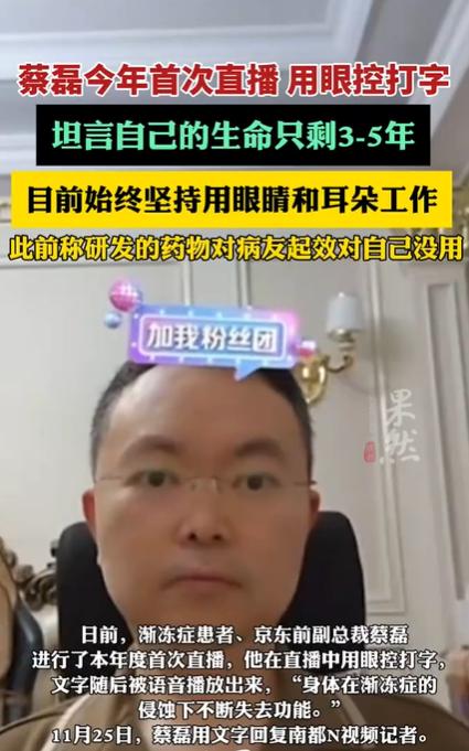 京东集团原副总裁蔡磊近日公开表示,自己被渐冻症(ALS)夺走的生命可能只剩下3到5年时间。这位44岁的商界精英、渐冻症抗争者面对死神的最后通牒,依然选择站在抗击罕见病的最前线。从叱咤风云的商业奇才到渐冻症病友的"领头雁",蔡磊用生命最后时光谱写了一曲震撼人心的抗争之歌。