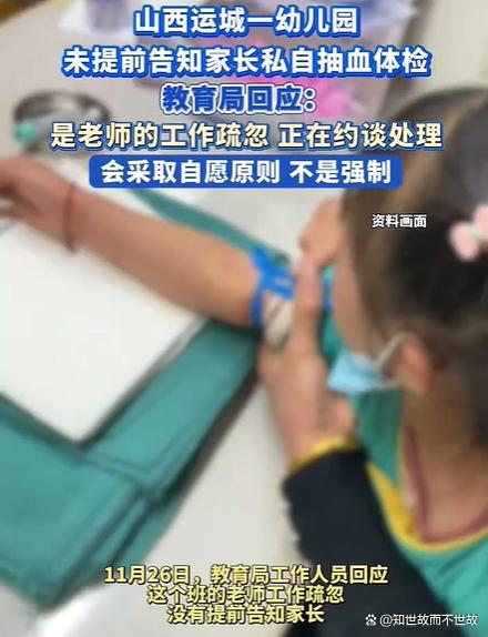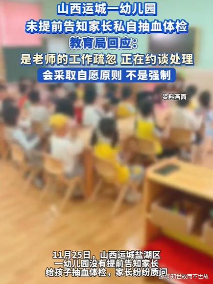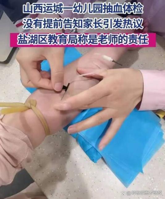 这次突如其来的抽血体检,发生在11月25日。盐湖区某幼儿园的孩子们在园内接受了包含抽血项目的体检,而家长们对此一无所知。